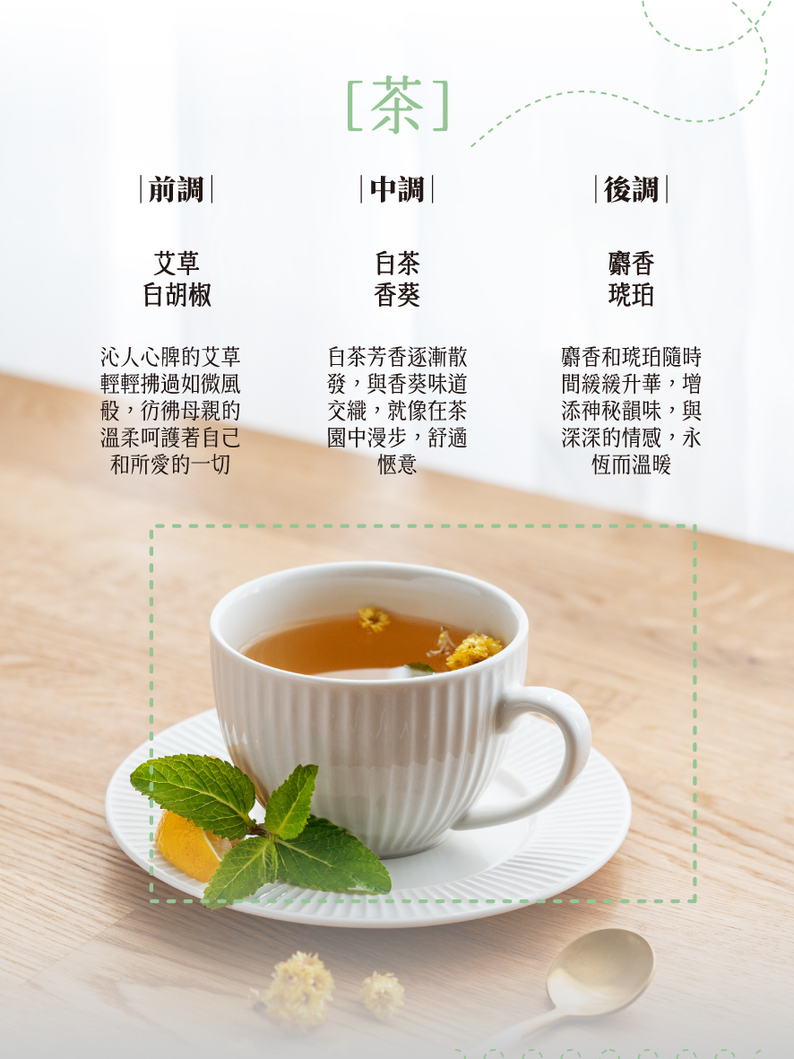 香氣味道: 白茶、艾草、麝香(茶香調)