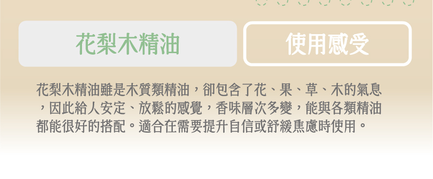 感受:帶來安定、放鬆的感覺,提升自信及舒緩焦慮